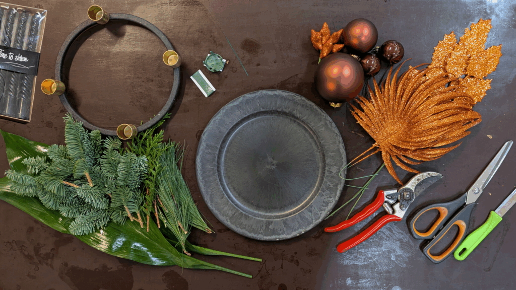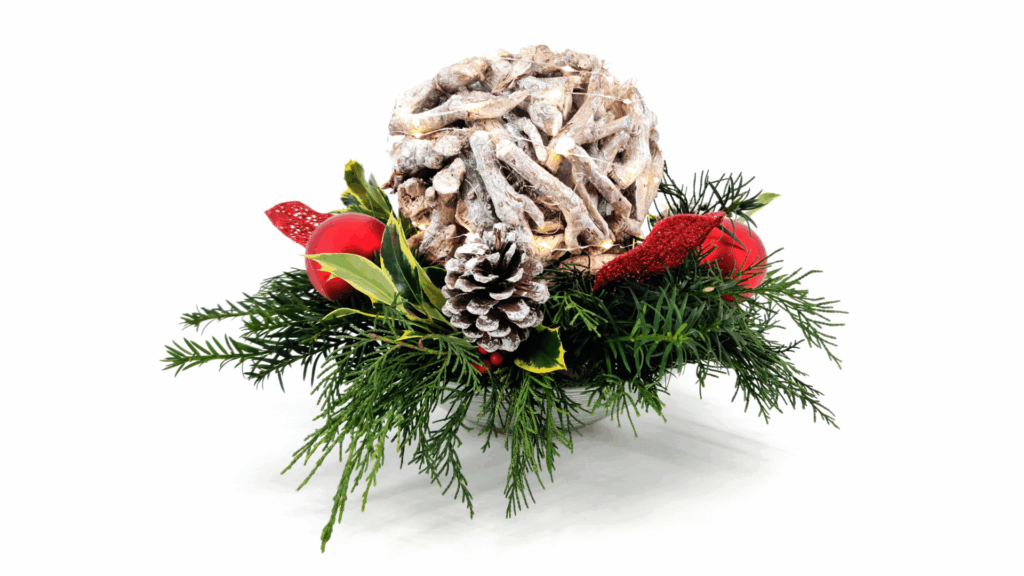 • Decoratiemateriaal (dennenappels, lint, kerstballen, glittertakken, besjes, enz.)